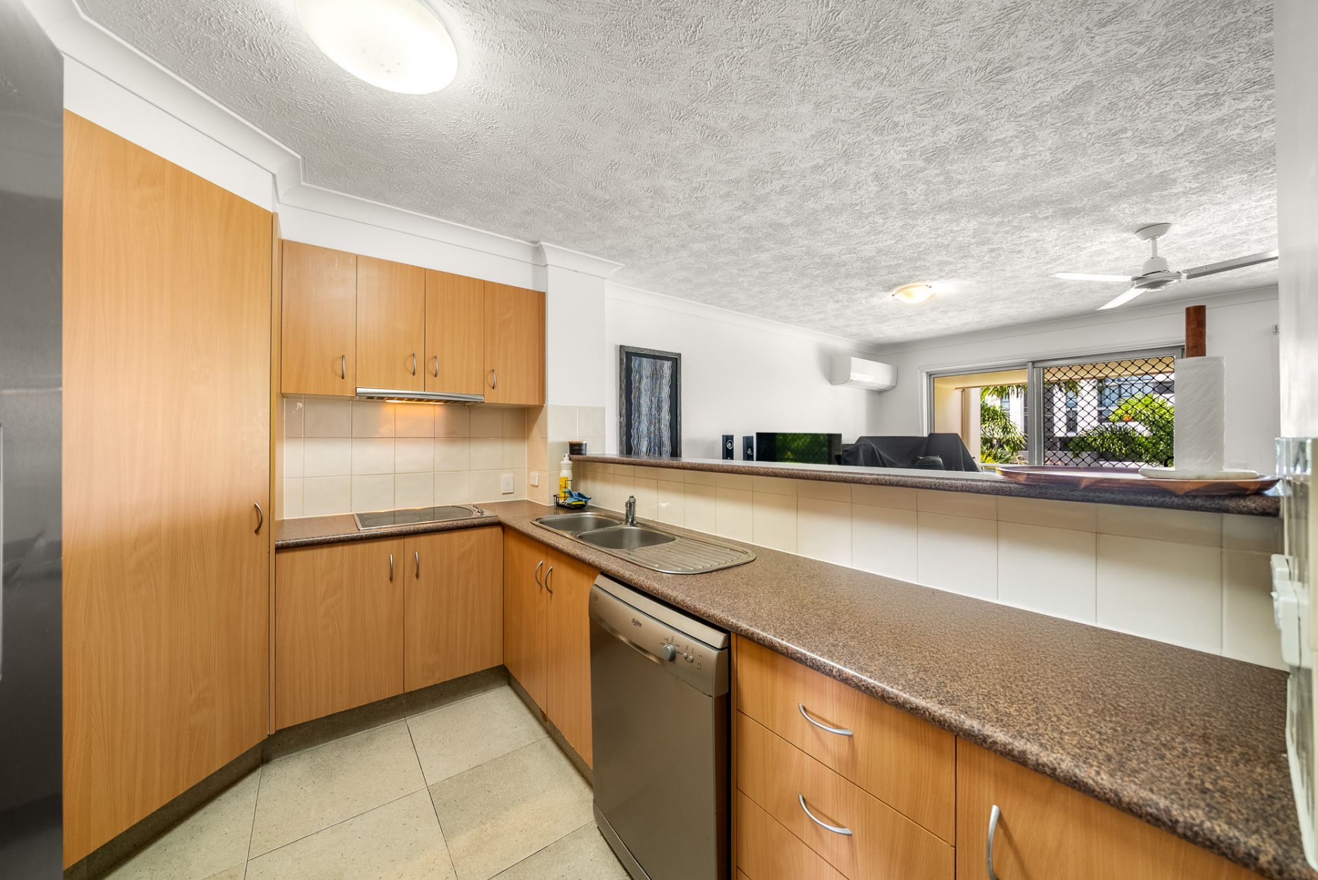 Inside, the apartment features an expansive open-plan living area with large split system air-conditioning, ceiling fans throughout, and a well-appointed kitchen in excellent condition. The main bathroom includes both a shower and bathtub, cleverly doubling as a laundry with a single vanity and ample storage.